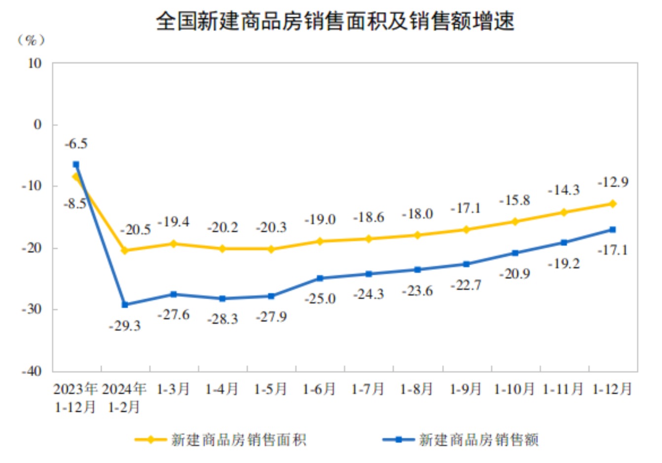 2024年,新建商品房销售面积97385万闲居米,比上年下落12.9%,其中住宅销售面积下落14.1%。新建商品房销售额96750亿元,下落17.1%,其中住宅销售额下落17.6%。